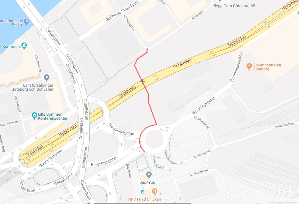 Nu får alla gående och cyklister ett tredje alternativ till att ta sig mellan Gullbergsstrandsområdet och centrum söder om E45 Götaleden. Sedan tidigare finns det som bekant dels en passage i väster vid Lilla Bommen, dels en passage i öster vid Falutorget, men nu öppnas alltså en ny, tredje passage.